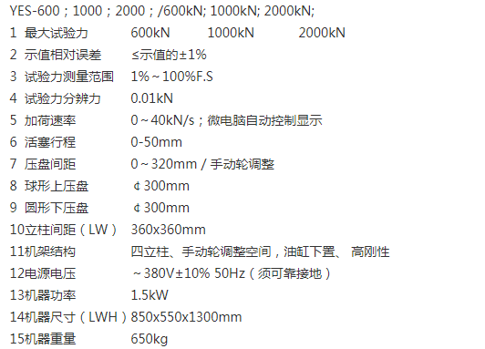 產(chǎn)品規(guī)格 YES-600;1000;2000;600kN;1000kN;;2000kN;YES系列經(jīng)濟型數(shù)顯式壓力試驗機