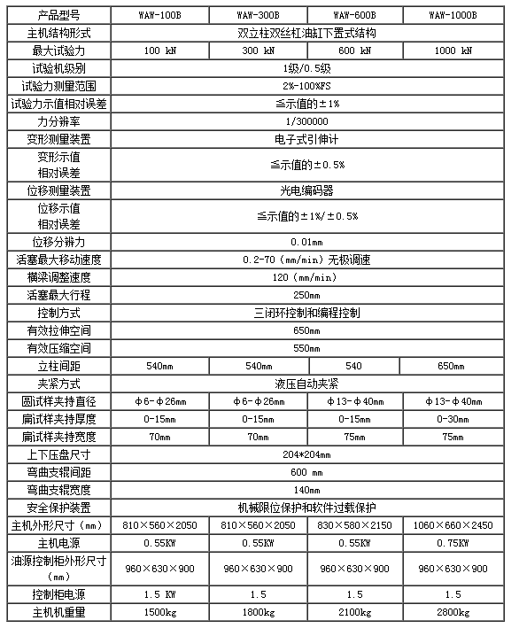濟南試金WAW-B系列微機控制電液伺服萬能試驗機主要用于金屬材料的拉伸、壓縮、彎曲等力學(xué)性能試驗,增加簡單的附件后可對水泥、混凝土、磚、瓦、橡膠及其制品進行檢測。